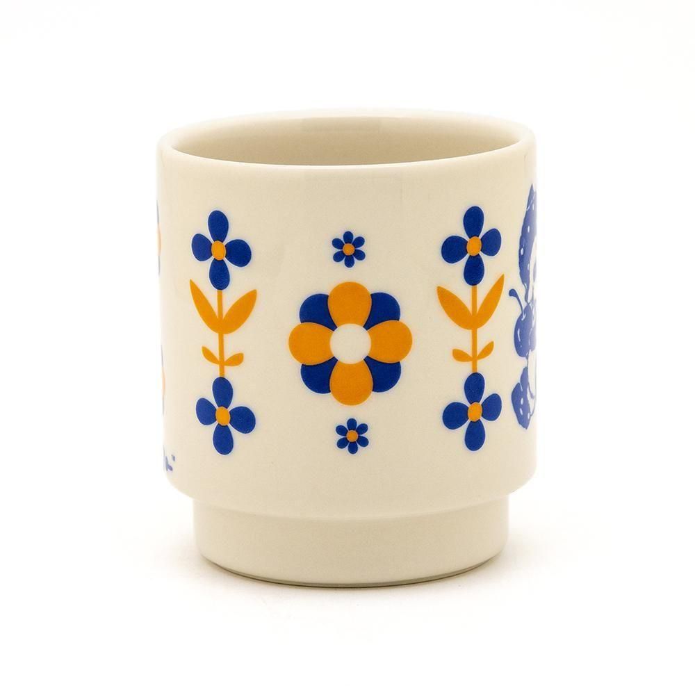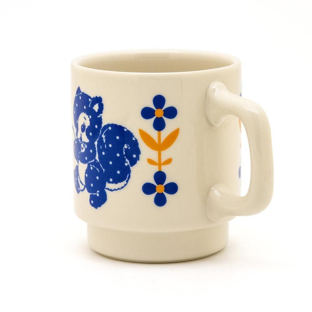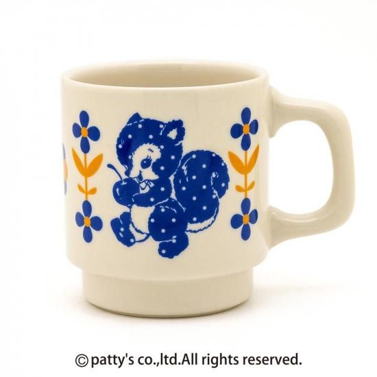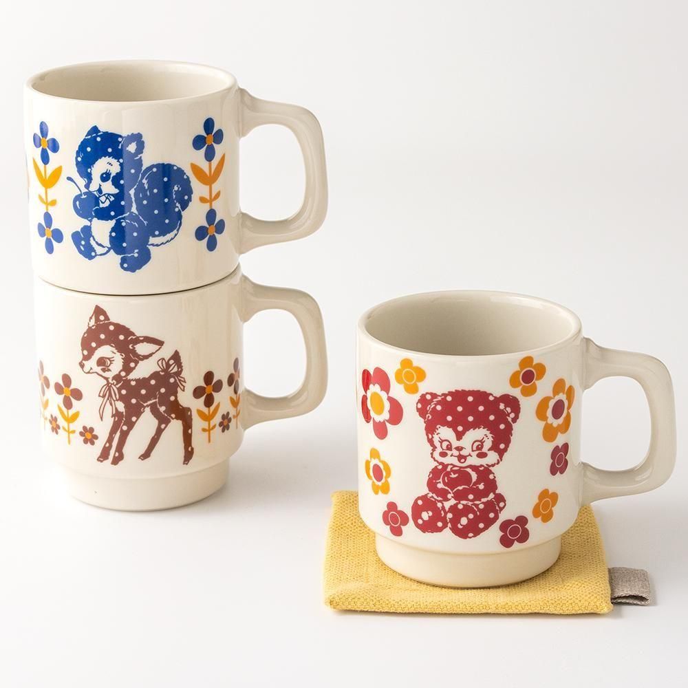 レトロタッチの水玉模様のリスと、お花が愛らしいスタッキングマグです。