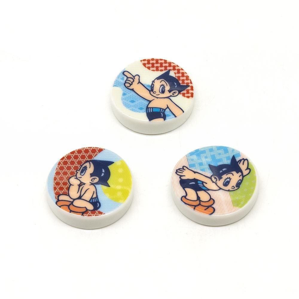 カラフルな和の伝統模様とかわいい表情のアトムを切り抜いた、円型の箸置きです。